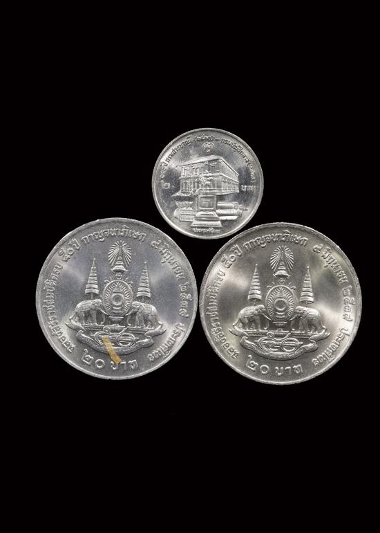 ชื่อพระเครื่อง *เคาะเดียว 3 เหรียญ* เหรียญ 20 บาท ในหลวงร.9 ฉลองสิริราชสมบัติ ครบ 50 ปี กาญจนภิเษก ปี2539 (((ไม่มีอุณาโลม 2 เหรียญ))) + เหรียญ 2 บาท 100 ปี กรมบัญชีกลาง ปี2533 (((บ้านเล็ก 1 เหรียญ))) ตัวติด
