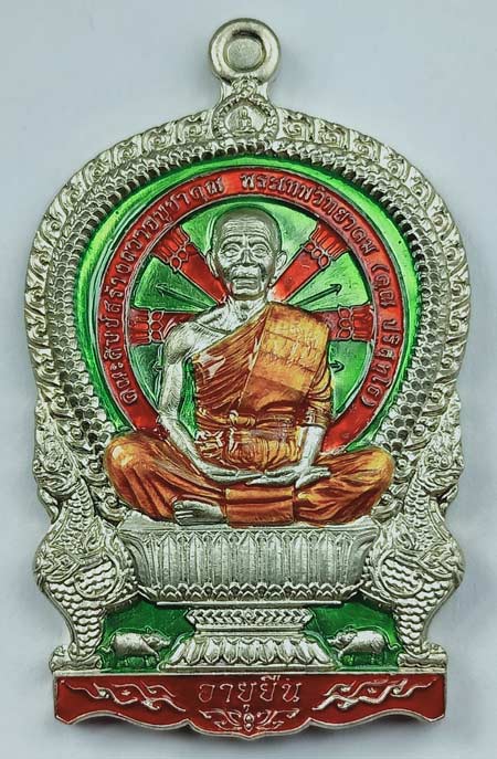เหรียญนั่งพานอายุยืน (หลังหนุมาน รุ่นแรก) หลวงพ่อคูณ วัดบ้านไร่ เนื้ออาปาก้าลงยา3สี(แยกชุดพระบูชานวะหน้าตัก18นิ้ว) เบอร์ 376 พร้อมกล่องครับ
