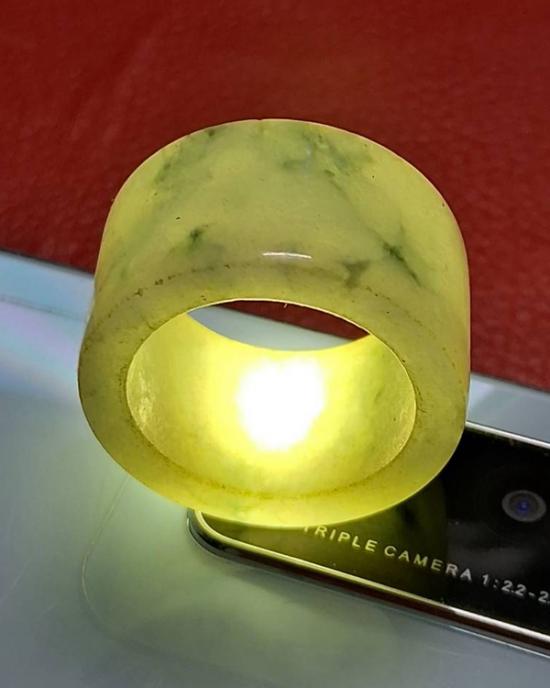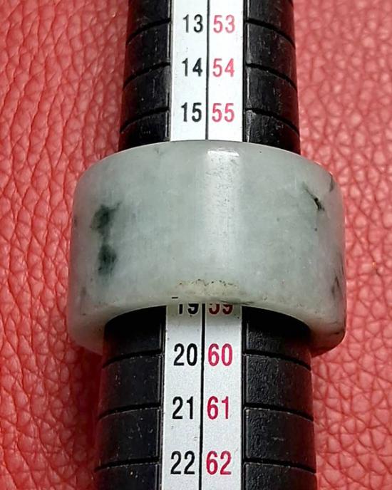 แหวนหยกทรงท่อ หยกพม่าแท้ 100 % (แสงส่องผ่าน) สีเขียวอ่อน ลวดลายธรรมชาติ สวยมากๆ เส้นผ่าศูนย์กลาง 1.9 ซม. หนา 1.4 ซม. หายาก (กท.16)