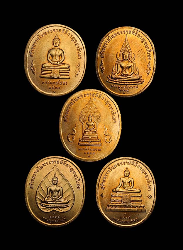 พระเหรียญชุดพระพุทธปัญจภาคี ครบชุด 5 เหรียญ เนื้อทองแดงผิวไฟ ที่ระลึกพระราชพิธีกาญจนาภิเษก ในหลวงรัชกาลที่ 9 หลังหลวงโสธร, หลังพระพุทธชินราช, หลังพระพุทธชินสีห์, หลังพระมงคลบพิตร, หลังพระนิรันตราย ปี