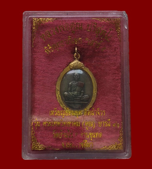 เหรียญพิเศษย้อนยุค ปี 19 รุ่นพระเทพวิทยาคม(คูณ) บารมี 91 เต็มองค์ ติดผ้าจีวร กล่องเดิม กรอบทองไมคอน