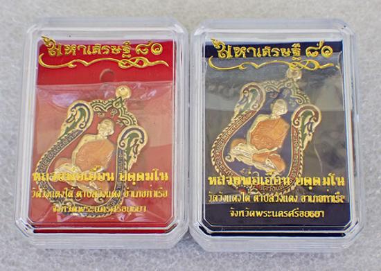 ชื่อพระเครื่อง $เคาะแรกเบาวัดใจทีเดียว 2 องค์ค่ะ เหรียญเสมา รุ่น มหาเศรษฐี ๘๐ หลวงพ่อเอื้อน วัดวังแดงใต้ จ.พระนครศรีอยุธยา เนื้อกะไหล่ทองลงยาสีแดง เลข ๑๑๐๕ + เนื้อกะไหล่ทองลงยาสีน้ำเงิน เลข ๑๓๘๙ พร้อมกล่องเดิมค่ะ$