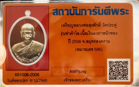 เหรียญฟาต้าไฉ หลวงพ่อพระมหาสุรศักดิ์ เนื้อเงินยาแดงหน้ากากทองคำ เลข 595 วัดประดู่ ปี2556 สมุทรสงคราม พร้อมบัตรรับรอง |