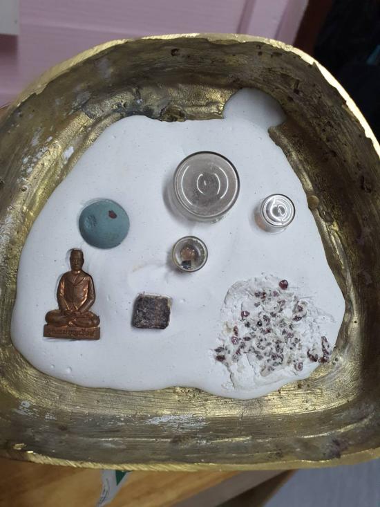 อุดมวลสาร ผงอัฐิกระดูกคุณแม่ เกศา ผงพระพุทโธน้อยรุ่นแรก พลอยเสก ลูกอมมวลสาร ข้าวตอกพระร่วง ทหายเงิน ทรายทอง และมวลสารรวมๆภายในองค์พระ และฝัง รูปเหมือนปั้มรุ่นแรกปี 2560 หลวงปู่ช่วงวัดอาวุธเสก