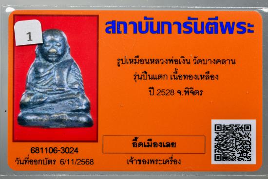 พระรูปหล่อโบราณ หลวงพ่อเงิน วัดบางคลาน รุ่นปืนแตก พิมพ์เศียรเล็ก เนื้อเก่า พ.ศ.2528 พร้อมบัตรรับรอง