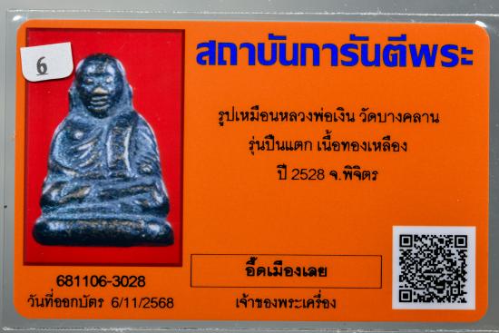 พระรูปหล่อโบราณ หลวงพ่อเงิน วัดบางคลาน รุ่นปืนแตก พิมพ์เศียรเล็ก เนื้อเก่า พ.ศ.2528 พร้อมบัตรรับรอง