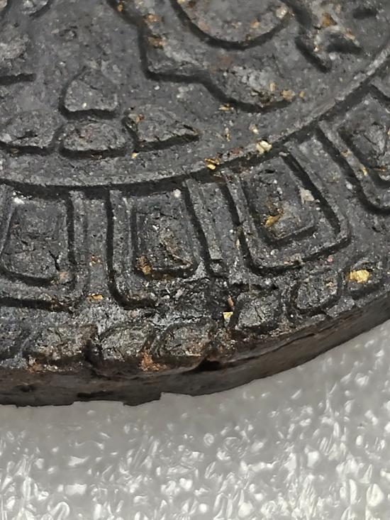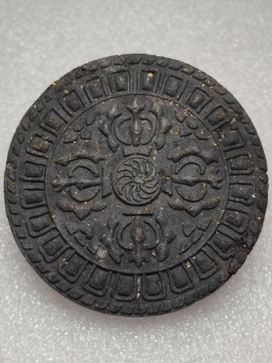 ผงว่านดวงตราพลังจักรวาล รุ่นแรก พระอาจารย์ประสูติ วัดถ้ำพระพุทธโกษีย์ (วัดในเตา) ปี 2548 เนื้อดำผงมหาพลับพลาชัยโรยตะไบทองคำ (องค์นี้มีรอยแตกซ่อมที่ขอบมานิดครับ) |