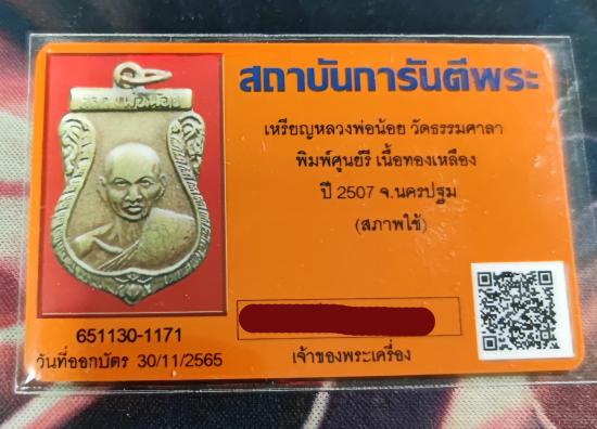เหรียญหลวงพ่อน้อย วัดธรรมศาลา จ.นครปฐม ปี 2507 พิมพ์ศูนย์เล็ก พร้อมบัตรรับรอง