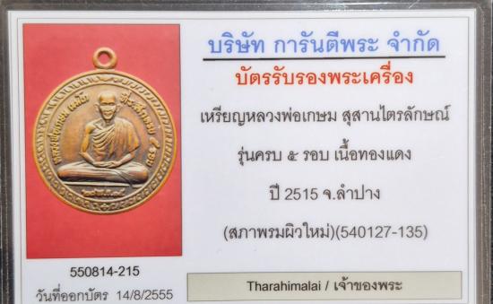 เหรียญหลวงพ่อเกษม รุ่นครบ 5 รอบ เนื้อทองแดง ปี 2515 พร้อมบัตรรับรอง