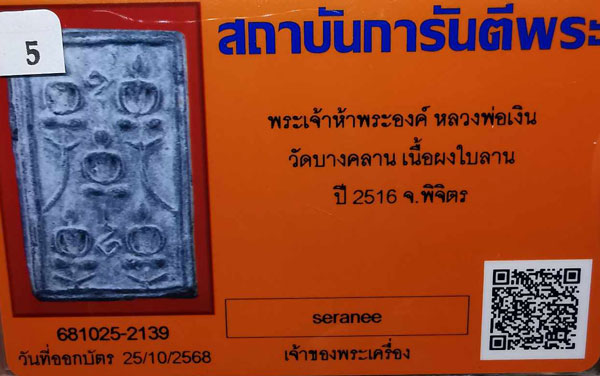 พระเจ้าห้าพระองค์ วัดบางคลาน เนื้อผงใบลาน ปี2516 จ.พิจิตร + บัตรG-pra สภาพเดิมค่ะ |