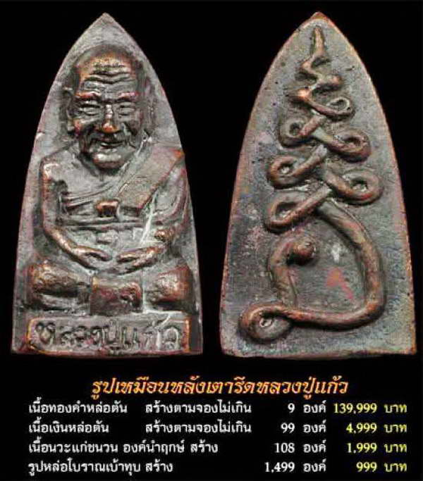 เริ่มที่ 500 ครึ่งราคาออกจากวัด วัดใจ สวยๆ เดิมๆ ไม่ผ่านการใช้ รูปเหมือนเตารีดหลังยันต์ หลวงปู่แก้ว วัดสะพานไม้แก่น รุ่นรับยศมหามงคล จ.สงขลา ปี 2555 หล่อโบราณ เบ้าทุบ สร้าง 1,499 องค์ ราคาออกวัด 999 บ |