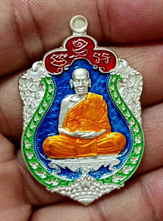 หลวงพ่อพัฒน์ เสมาสิงห์พยัคฆ์พันล้าน เนื้อเงินลงยาฟ้า ขอบเขียว ซุ้มแดง.NO.๒๕๖