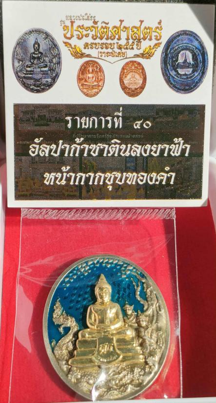 เหรียญพระพุทธโสธร(หลวงพ่อโสธร) รุ่น ประวัติศาสตร์ครบรอบ ๒๕๕ปี(วาระพิเศษ) วัดโสธรวราราม จ.ฉะเชิงเทรา เนื้ออัลปาก้าซาติน คุ้ยพื้นลงยาฟ้า หน้ากากชุบทองคำ หลังวิหารหลวงพ่อโสธร หมายเลข ๔๒ พร้อมกล่อง |