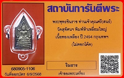 พระพุทธชินราช ท่านเจ้าคุณศรี(สนธ์) วัดสุทัศนฯ พิมพ์ห้าเหลี่ยมใหญ่ เนื้อทองเหลือง ปี2494 มีบัตรรับรองจีพระ เคาะเดียว(แกะจากเลี่ยมพลาสติกใส่ตลับตัด) |
