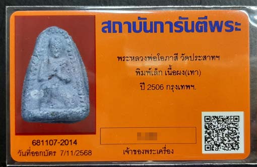 หลวงพ่อโอภาสี วัดประสาทฯ พิมพ์เล็ก เนื้อผง(เทา) ปี2506 กทม. พร้อมบัตรรับรองครับ |