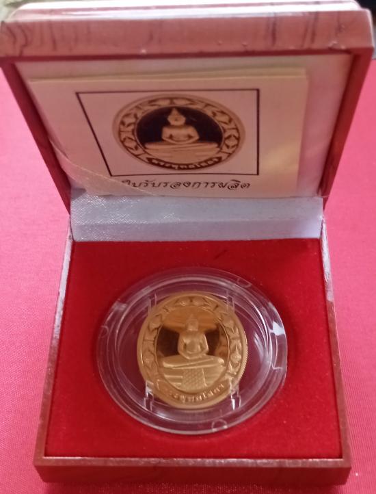 เหรียญพระพุทธโสธร รูปไข่ลายดอกไม้ ทองแดงขัดเงาชุบทอง ปี2542 ออกวัดโสธรวรารามวรวิหารปี2542 พร้อมใบรับรองการผลิต