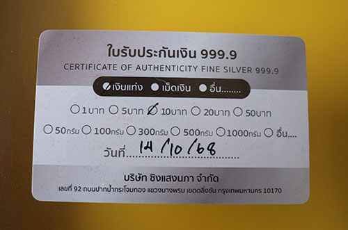 เงินแท่ง 999.9% น้ำหนัก 10 บาท ของใหม่(อยู่ในซีล) พร้อมใบรับประกัน