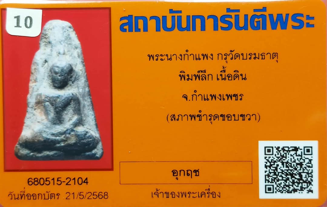 ชื่อพระเครื่อง วัดใจ พระนางกำแพง กรุวัดบรมธาตุ พิมพ์ลึก เนื้อดิน จ.กำแพงเพชร พร้อมบัตรรับรองจากจีพระ