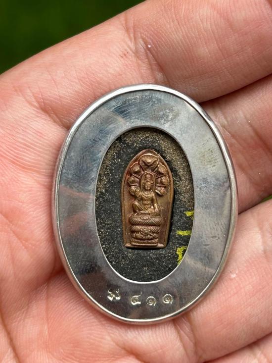 ล็อกเก็ตนายพล พิมพ์รูปไข่ เลี่ยมจับขอบเงิน หลังอุดผงพรายกุมาร ฝังปรกทองแดง โรยผงตะไบ |