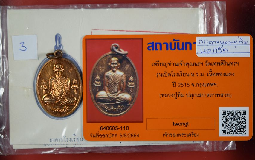 เหรียญเจ้าคุณนรฯ 4 โค๊ต รุ่นเปิดโรงเรียนนวมราชานุสรณ์ ปี 2515 เนื้อทองแดงผิวไฟ ส่งมอบพร้อมใบกำกับและบัตรรับรองจีพระ หลวงปู่ทิม วัดละหารไร่ร่วมปลุกเสก เคาะเดียวแดง |