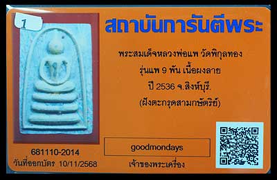 สมเด็จแพ 9 พัน เนื้อลายฝั่งตะกรุด ปี2536 หลวงพ่อแพ วัดพิกุลทอง สิงห์บุรี |