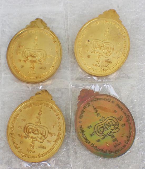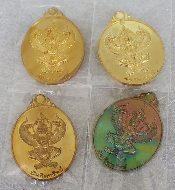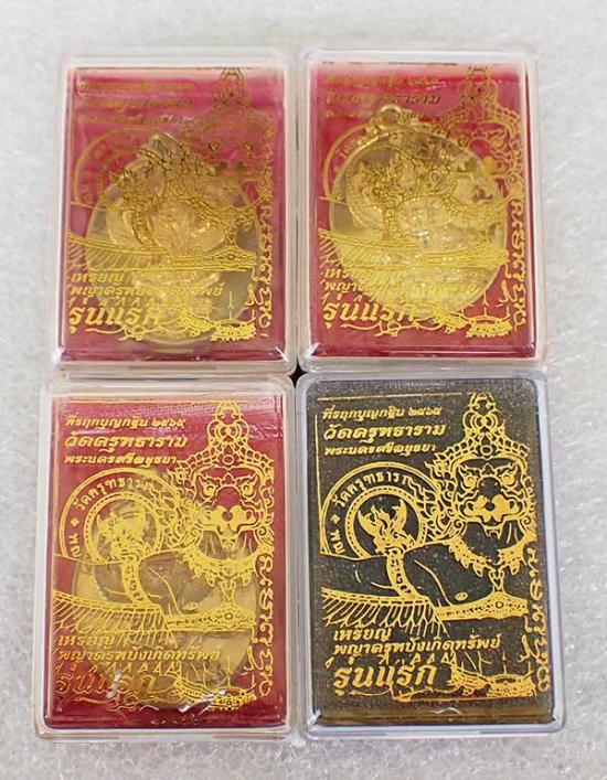$วัดใจทีเดียว 4 องค์ค่ะ เหรียญพญาครุฑบังเกิดทรัพย์ (4 cm.รวมห่วง) รุ่นแรก วัดครุฑธาราม จ.พระนครศรีอยุธยา เนื้อทองเหลือง เลข ๓๖๘, ๕๓๒, ๕๙๒ + เนื้อทองเหลืองผิวรุ้ง เลข ๑๑๖ ซีลเดิม พร้อมกล่องเดิมค่ะ$