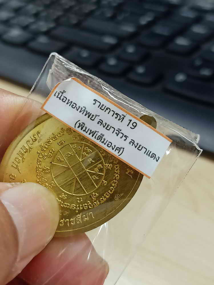 วัดใจ 100 เหรียเจริญพร หลวงพ่อคูณ วรปฺโ วัดบัลลังก์ อ.โนนไทย จ.นครราชสีมา ปี 2565 เนื้อกะไหล่ทอง ลงยาแดง ครึ่งองค์ หมายเลข 959 กล่องเดิม |