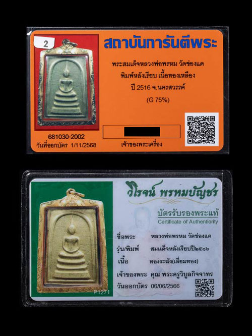 สมเด็จทองระฆัง หลวงพ่อพรหม วัดช่องแค จ.นครสวรรค์ ปี 2516 เนื้อทองระฆัง ยอดนิยม พิมพ์มือซ้อนนิยม สุดหายาก! + บัตรรับรอง GPRA ***พระแกะจากเลี่ยม ไม่มีกรอบทองแล้ว***
