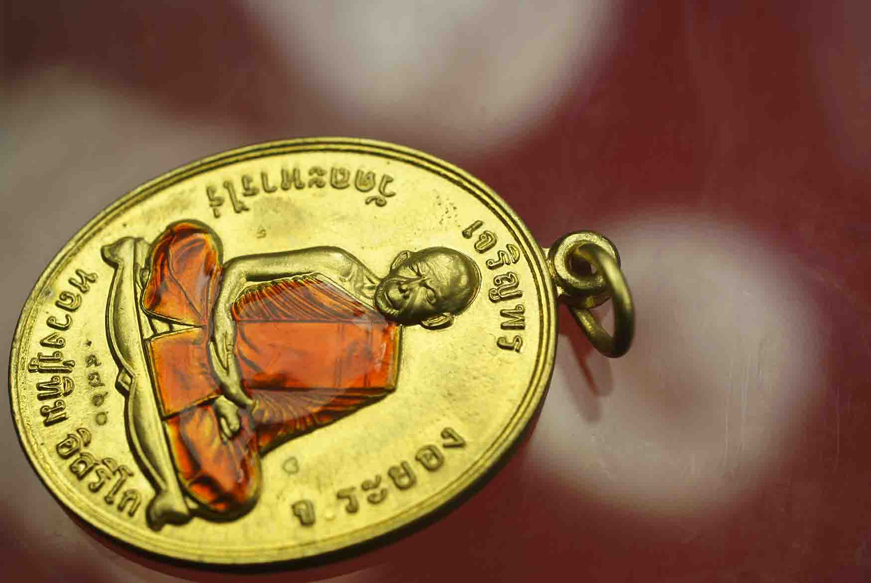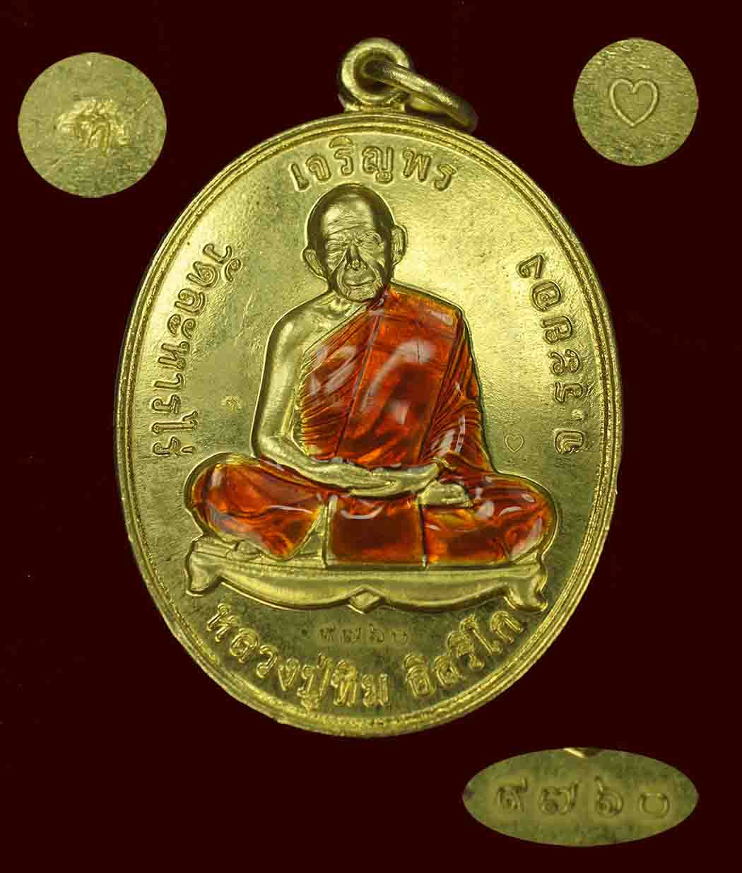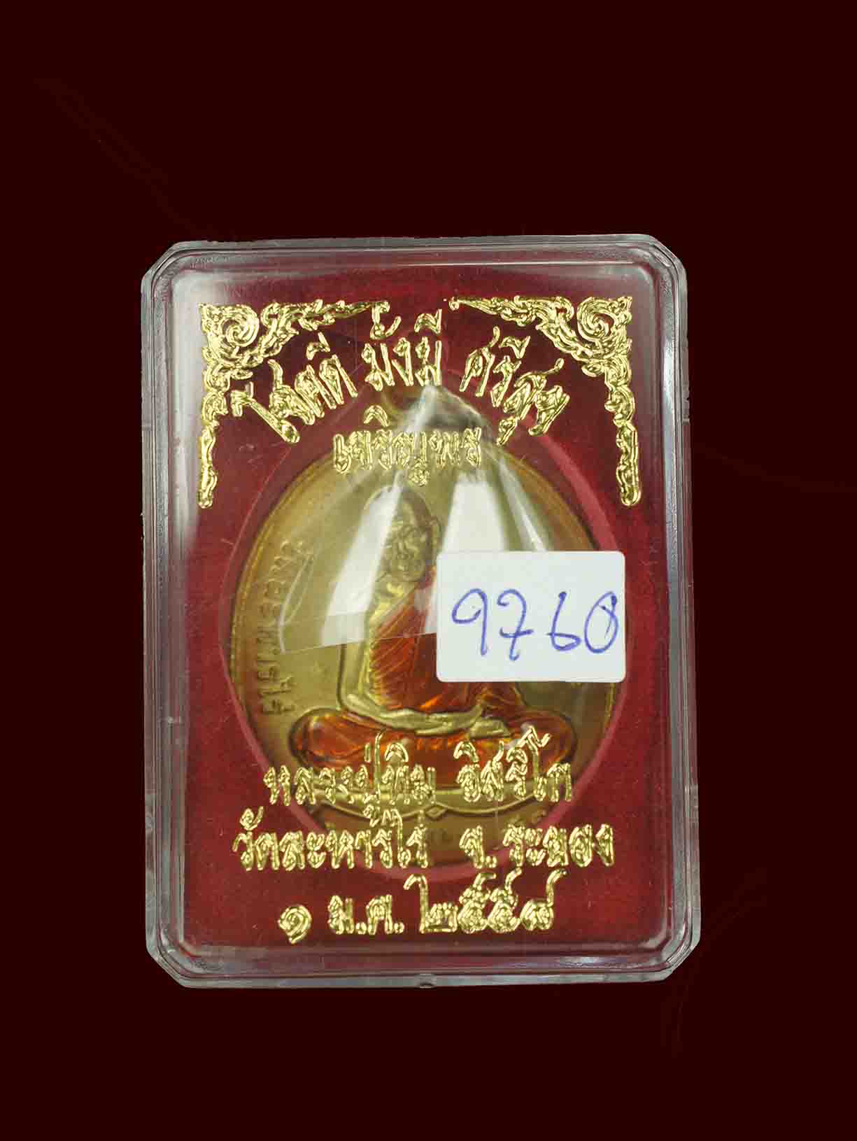 เหรียญโชคดี มั่งมีศรีสุข เนื้อทองฝาบาตร ลงยาจีวรเหลือง ปี 2557 หมายเลข **9760** ด้านหน้า ตอกโค๊ต หัวใจ โค๊ตตัว *ท* พิธีปลุกเสก โบสถ์ วัดละหารไร่ ระยอง พร้อมกล่องเดิมจากวัด |