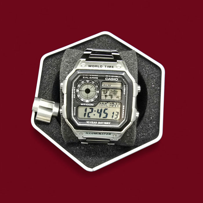 AE-1200 มีหน้าปัดดิจิตอลที่ได้แรงบันดาลใจมาจากแผงการแสดงผล องค์ประกอบดีไซน์อย่างจอ LCD สไตล์อะนาล็อกที่แสดงเข็มนาฬิกาเป็นแบบดิจิตอลและการแสดงแผนที่โลกที่รากฐานมาจากนาฬิกาที่เปิดตัวในช่วงปี 1980 เพื่อรองรับอินเทอร์เฟซดิจิตอลแบบมัลติฟังก์ชัน AE-1200 ใช้งาน LCD ที่มี 248 ส่วน ซึ่งเป็นไปได้ด้วยการออกแบบโมดูลอย่างพิถีพิถันและเทคนิคการผลิตขั้นสูงที่ทำให้จัดการวงจรที่ซับซ้อนได้อย่างแม่นยำและเชื่อถือได้ |