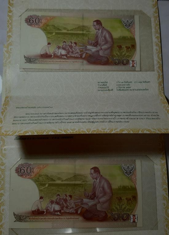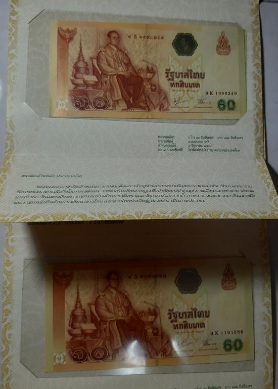 ธนบัตรที่ระลึก 60 บาท พระบาทสมเด็จพระเจ้าอยู่หัวรัชกาลที่ 9 ฉลองสิริราชสมบัติครบ 60 ปี 2 ใบ |