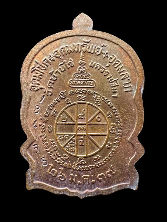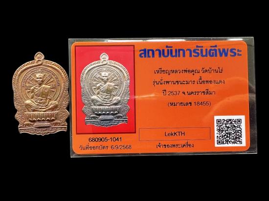 เหรียญนั่งพานหลวงพ่อคูณ วัดบ้านไร่ รุ่นนั่งพานชนะมาร เนื้อทองแดง ปี 2537 จ.นครราชสีมา หมายเลข 18455 พร้อมบัตร |
