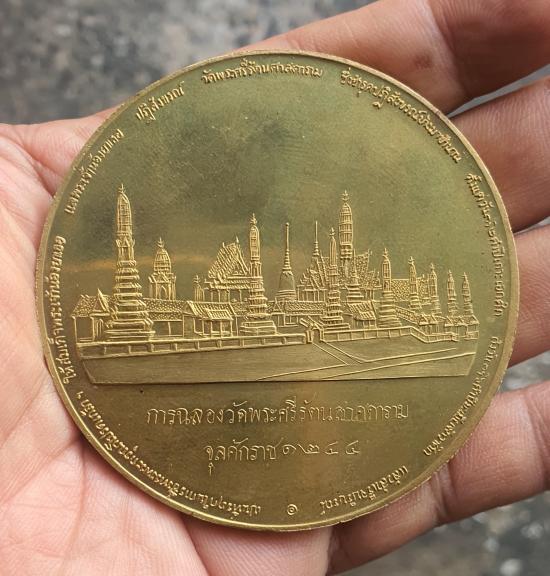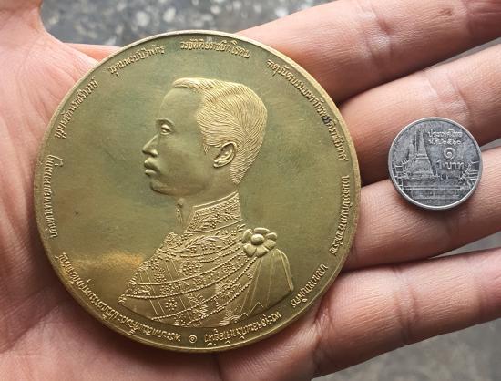เหรียญรัชกาลที่ 5 ที่ระลึก"สมโภชกรุงเทพฯ 100ปี" เส้นผ่านศูนย์กลาง 71มม. เป็นเหรียญขนาดใหญ่สุดในรัชสมัยรัชกาลที่5 เนื้อทองเดงกะหลั่ยทองด้านหน้าพระบรมรูปทรงผินพระพักตร์เบื้องซ้าย ด้านหลังภาพวัดพระแก้ว ม |