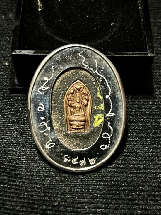 ล็อกเก็ต รุ่นนายพลเหนือดวงพร้อมเหรียญเลื่อนสมณศักดิ์ พิมพ์รูปไข่ เลี่ยมเงิน หลังอุดผงพรายกุมาร no. 472 ฝังปรกเบญจ​ฤทธิ์​ 1 องค์