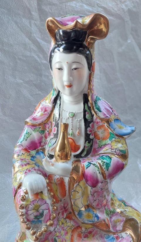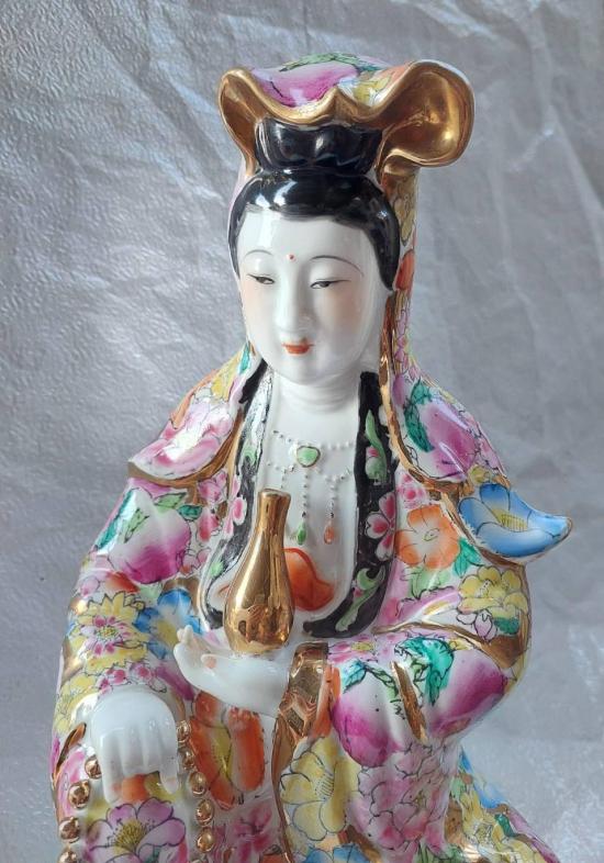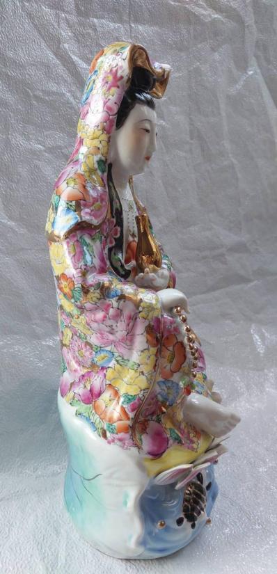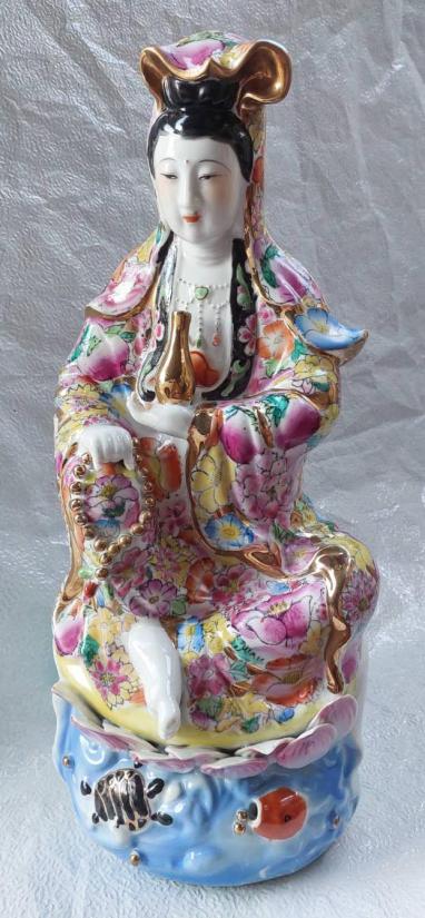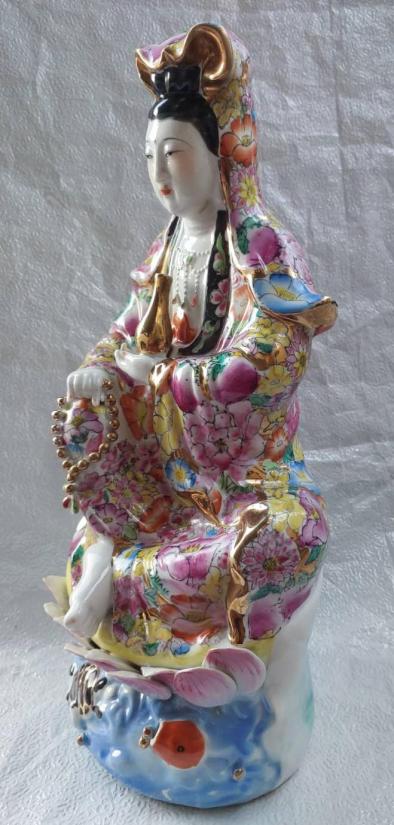 เจ้าแม่กวนอิมนั่งชันเข่า งานกระเบื้องกังไสเก่า สูง 18 นิ้ว