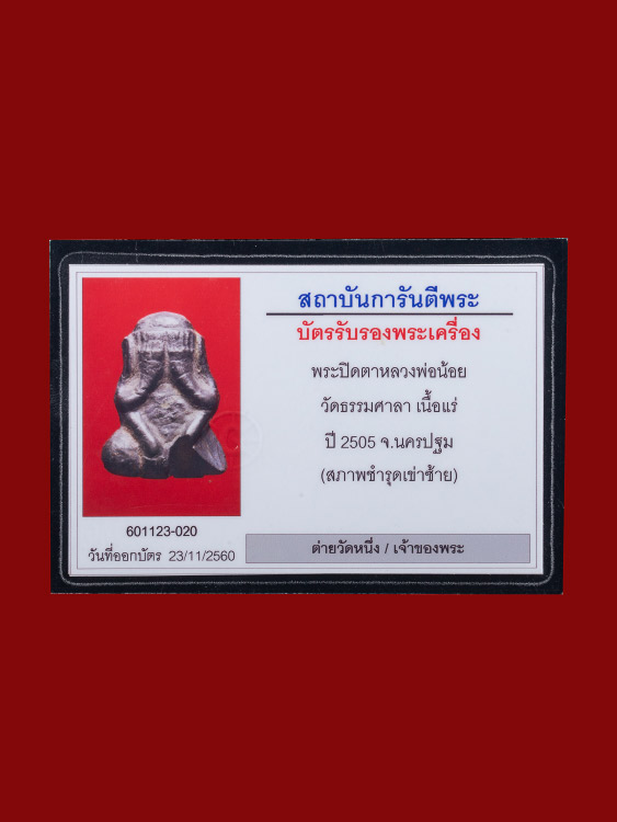 พระปิดตาหลวงพ่อน้อย วัดธรรมสาลา พร้อมบัตรรับรองจากเว็บครับ ผมไม่ทราบที่ ยี่ห้อรุ่นครับ พระรังเก่า ชุดนี้ผมไปเหมาบ้านที่กรุงเทพฯมาได้มาหลายอย่าง ทยอยลงครับ วัดใจเท่าไหนเท่านั้นครับ