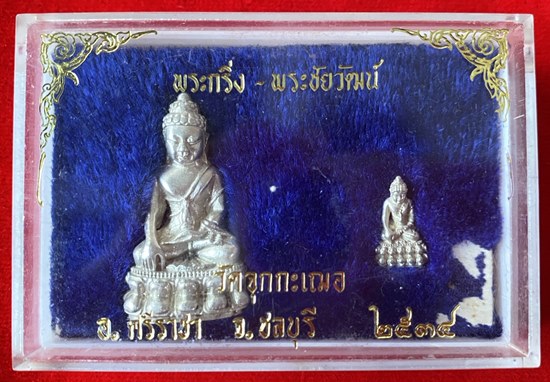 ชุดพระกริ่ง พระชัยวัฒน์ ปรโม รุ่น2 หลวงพ่อเริ่ม วัดจุกกะเฌอ ( เนื้อเงิน ) หายาก ปี 2534 จ.ชลบุรี สภาพสวยเดิม กริ่งดัง กล่องเดิม มาพร้อมบัตรรับรองครับ
