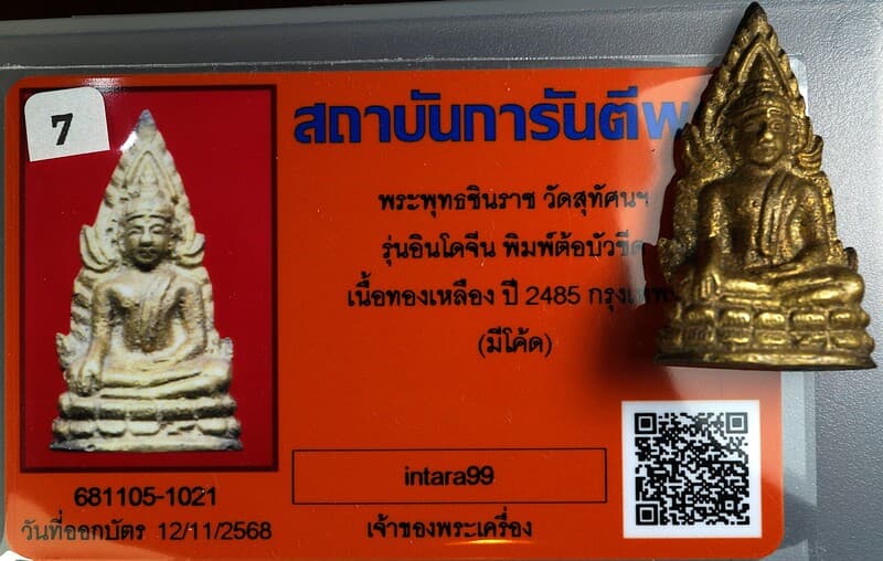 พระพุทธชินราช รุ่นอินโดจีน พิมพ์ต้อบัวขีด เนื้อทองเหลือง พ.ศ.2485 วัดสุทัศน์ กรุงเทพ (มีโต๊ด) พร้อมบัตร G-Pra |