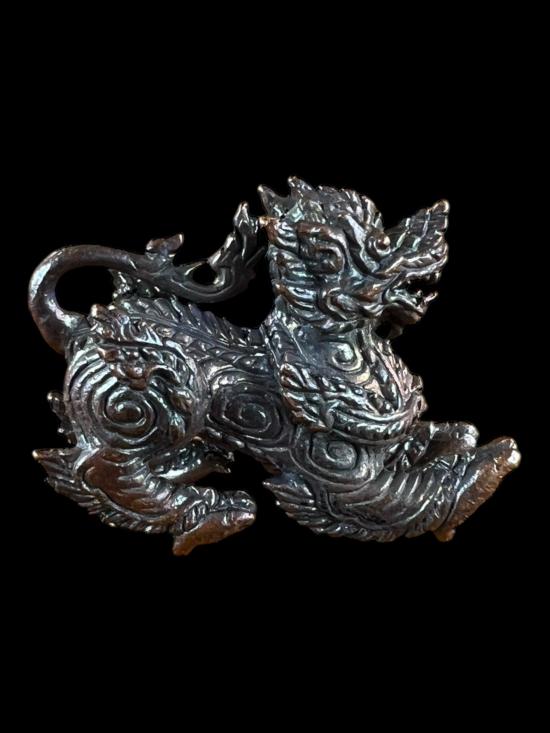 สิงห์เมตตามหาบารมี หลวงพ่อพูล วัดไผ่ล้อม จ.นครปฐม ปี2546 เนื้อนวโลหะแก่ทอง พร้อมกล่องเดิม |