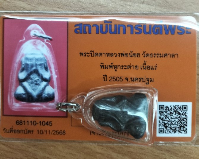 ปิดตาหลวงพ่อน้อย พิมพ์หูกระต่าย เนื้อแร่ ปี2505 วัดธรรมศาลา พร้อมบัตรรับรอง