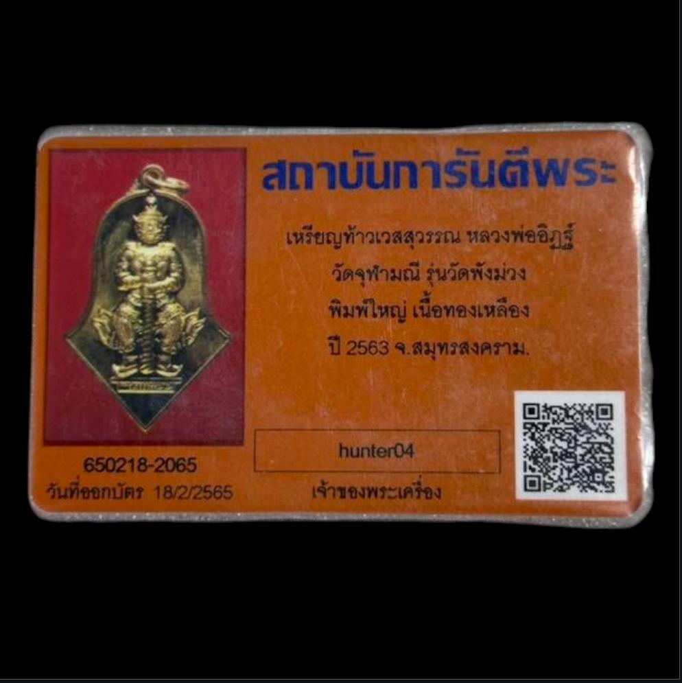 เคาะเดียวพร้อมบัตรรับรอง เหรียญท้าวเวสสุวรรณ หลวงพ่ออิฐ วัดจุฬามณี รุ่นวัดพังม่วง พิมพ์จำปีใหญ่ กล่องเดิม พร้อมบัตรรับรอง |