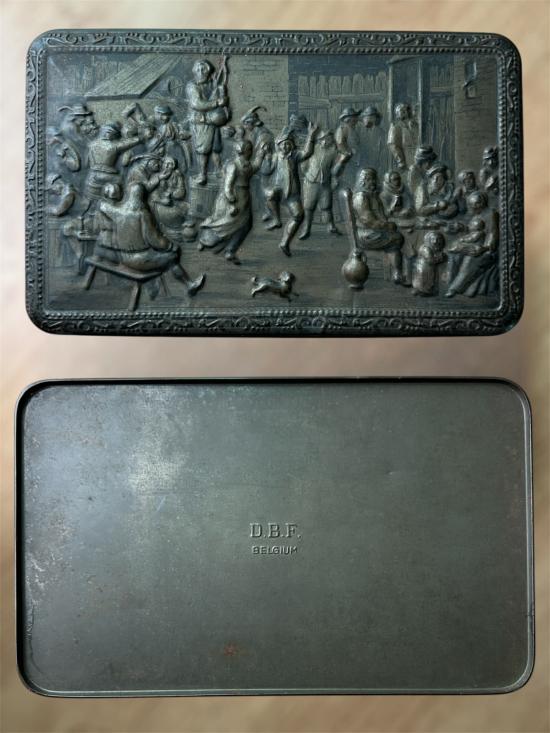 กล่องบิสกิต โบราณ teniers ลายนูน ปี 24XX ฝรั่งเล่นกันพัน+