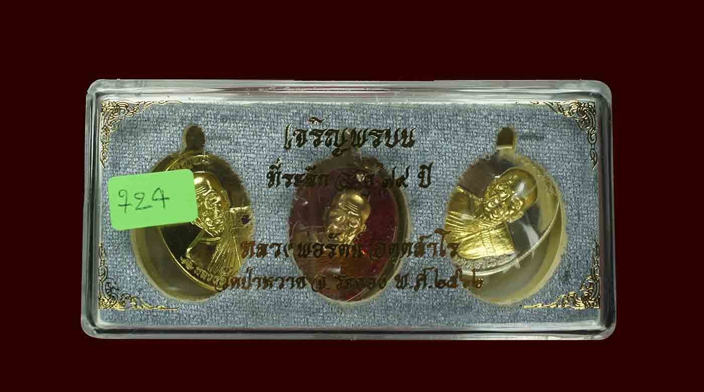 เหรียญเจริญพรบน รุ่น 69 ปี หลวงพ่อรัตน์ วัดป่าหวาย ระยอง ปี 2562 ชุดกรรมการ 3 เหรียญ สร้าง 799 ชุด หมายเลข 724 ( หมายเลขเดียวกันทั้งชุด ) พร้อมกล่องเดิมจากวัด