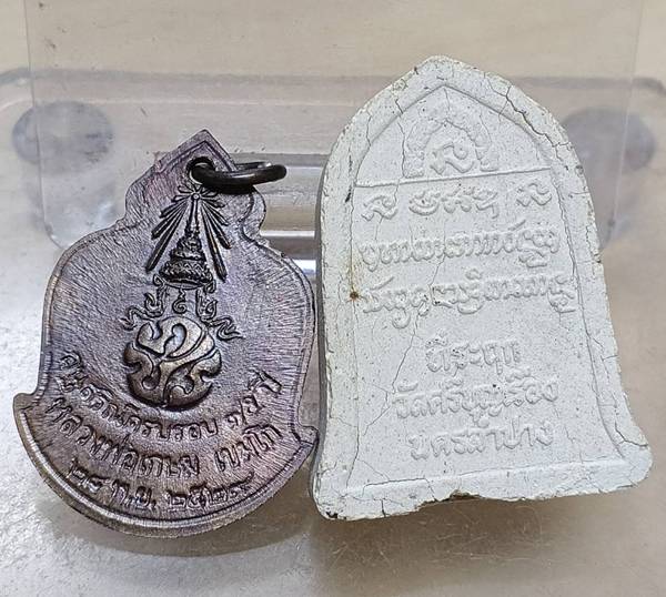 ลำปาง หลวงพ่อเกษม เนื้อผง+ เหรียญ ฯ 75 ปี + |