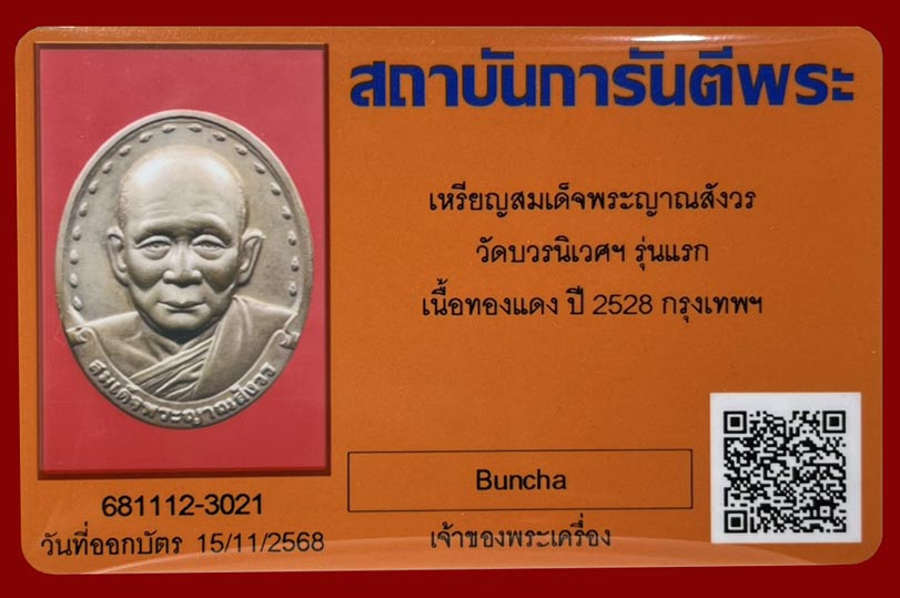 วัดใจ...เหรียญรุ่นแรก สมเด็จพระญาณสังวรฯ วัดบวรนิเวศฯ ปี2528 เนื้อทองแดง ผิวเดิมๆ สภาพสวย ไม่ผ่านการใช้ บัตรรับรอง อุ่นใจครับ.