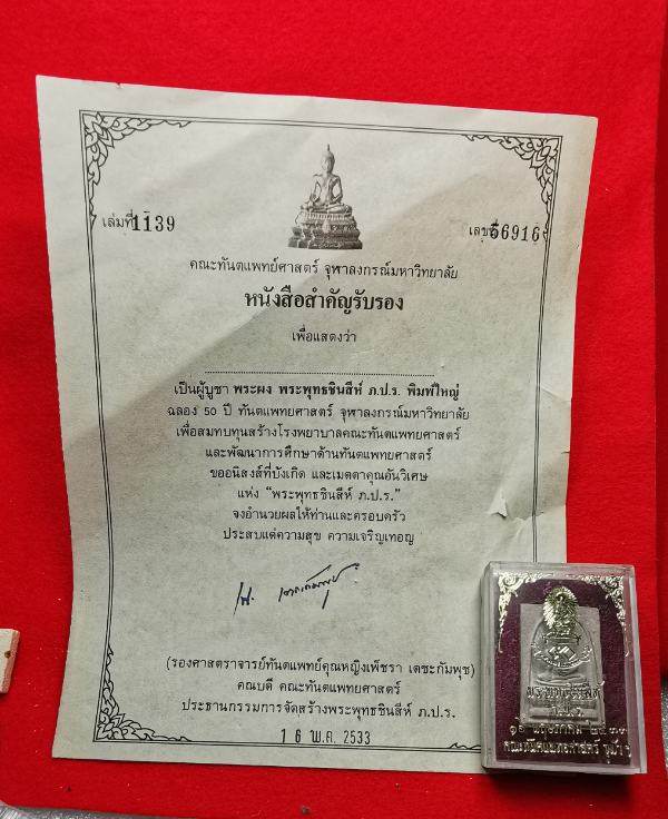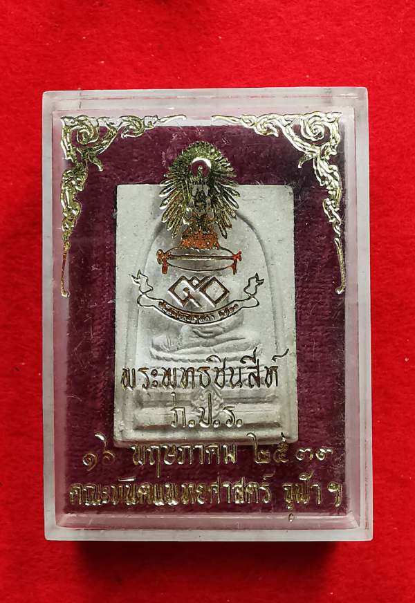 พระพุทธชินสีห์ ภปร. ทันโตเสฏโฐ พิมพ์ใหญ่ 50ปี คณะทันตแพทย์จุฬาฯ ปี 2533 (มีผงพระทนต์ในหลวง) มีพลอยด้านหลัง สภาพสวยพร้อมกล่องเดิม |