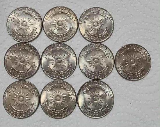 เหรียญ 1 บาท เอเชี่ยนเกมส์ ครั้งที่ 6 ในหลวงคู่ราชินี พ.ศ.2513 ในสมัยรัชกาลที่ 9 สภาพไม่ผ่านใช้แกะแบ่งจากถุง จำนวน 10 เหรียญ ครับ |