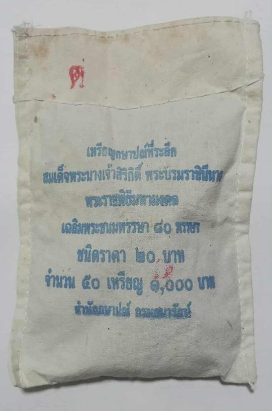เหรียญ 20 บาท นิเกิล ที่ระลึกสมเด็จพระนางเจ้าสิริกิติ์ พระราชพิธีมหามงคลเฉลิมพระชนมพรรษา 80 พรรษา จำนวน 50 เหรียญ สภาพสวยพร้อมถุงเดิมครับ จำนวน 1 ถุง ครับ |