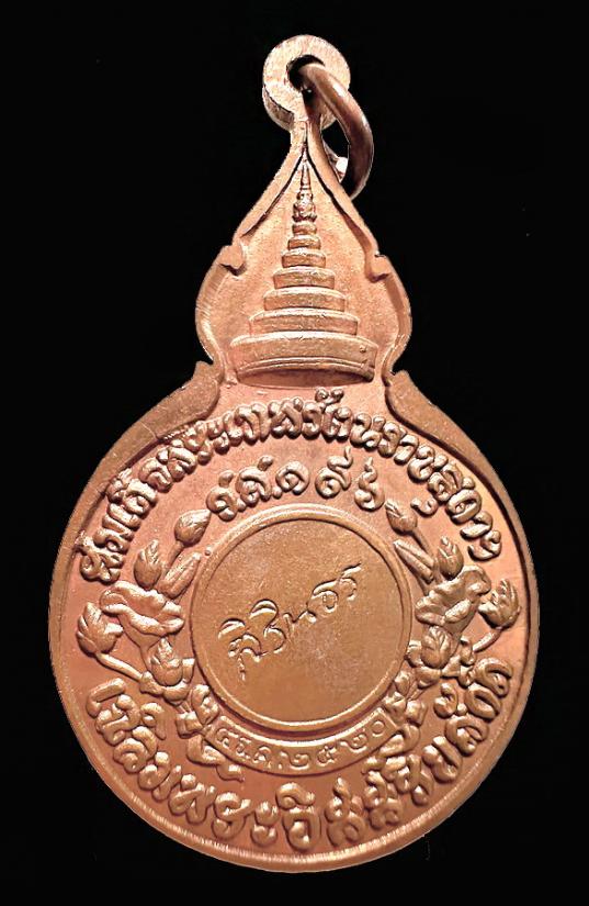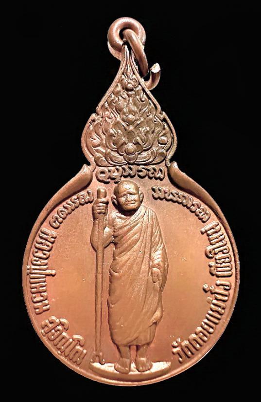 เหรียญทองแดงใหญ่ยืนถือไม้เท้าหลัง พระฉายาสิรินธร หลวงปู่แหวน วัดดอยแม่ปั๋ง ปี 2520 |