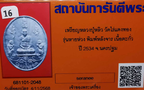 เหรียญหลวงปู่หลิว วัดไร่แตงทอง รุ่นหายห่วง พิมพ์หลังจาร เนื้อตะกั่ว ปี2534 จ.นครปฐม + บัตรG-pra สภาพเดิมค่ะ สภาพตามรูปทุกประการค่ะ